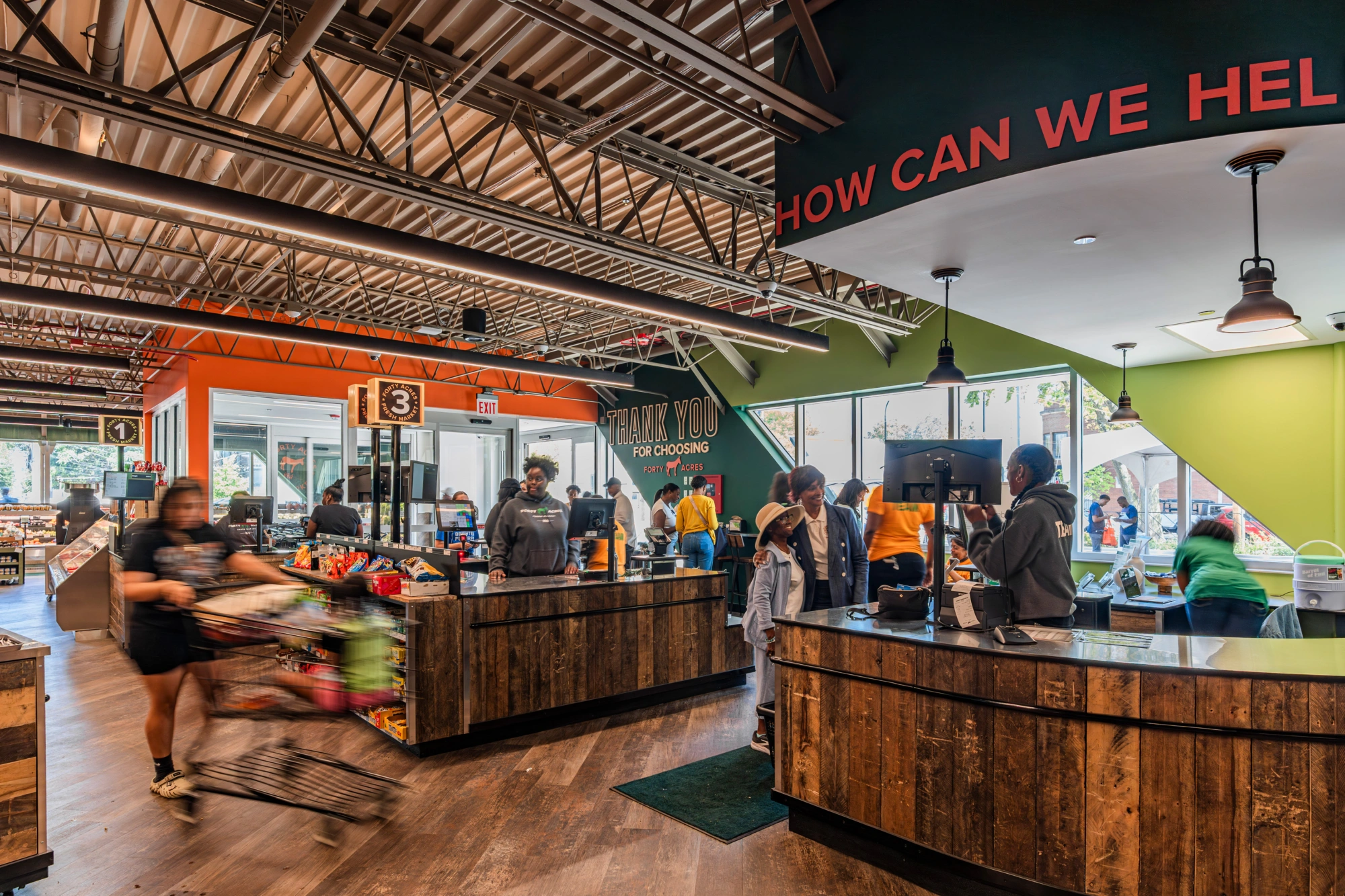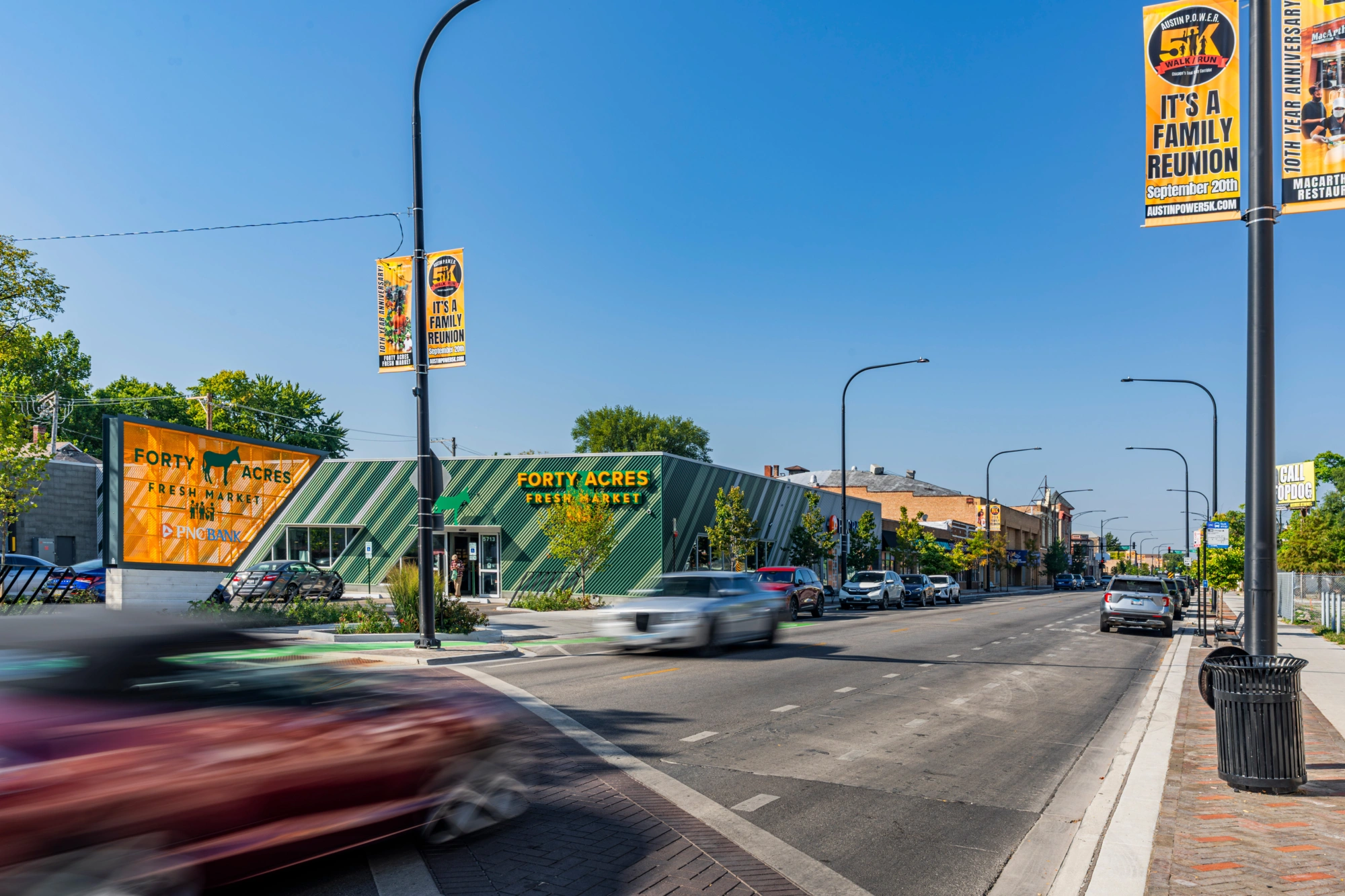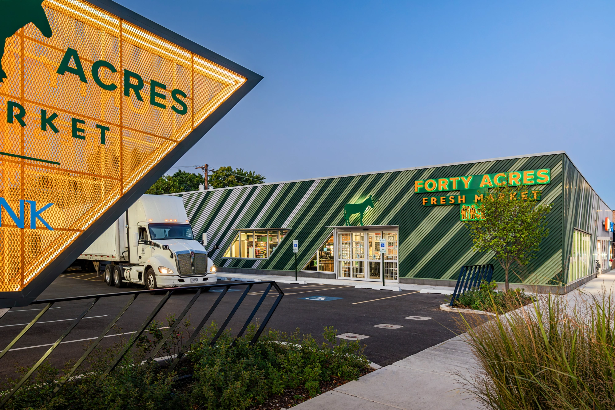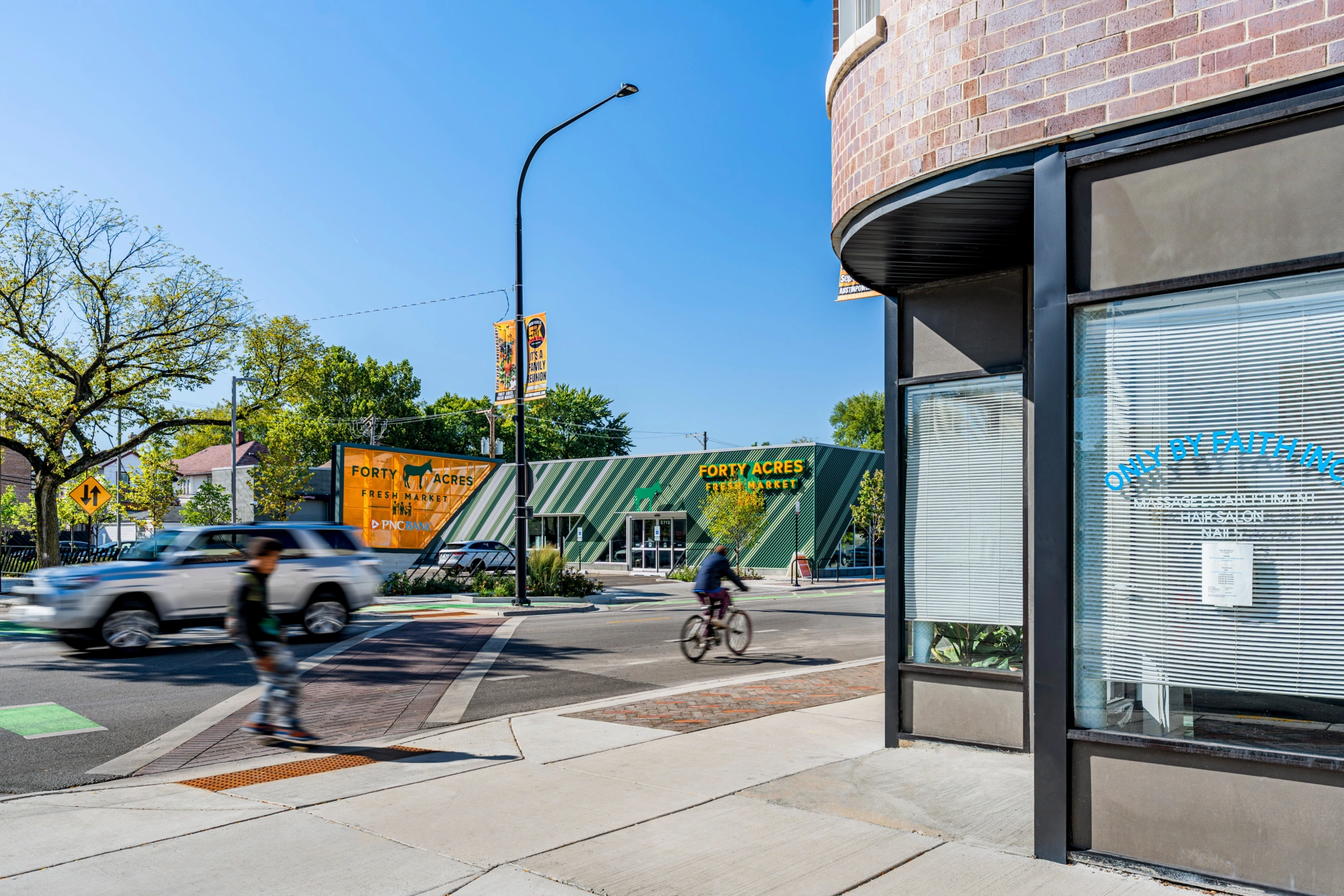 Serving Chicago’s Austin Neighborhood with fresh produce deliveries since 2018, Forty Acres Fresh Market acquired a former Salvation Army on Chicago Avenue to expand its operations into a full-fledged grocery store. Latent worked with Liz owner of FAFM + their community development partner West Side Health Authority to design the new grocery store with a featured Bank tenant space that was ultimately filled by PNC.