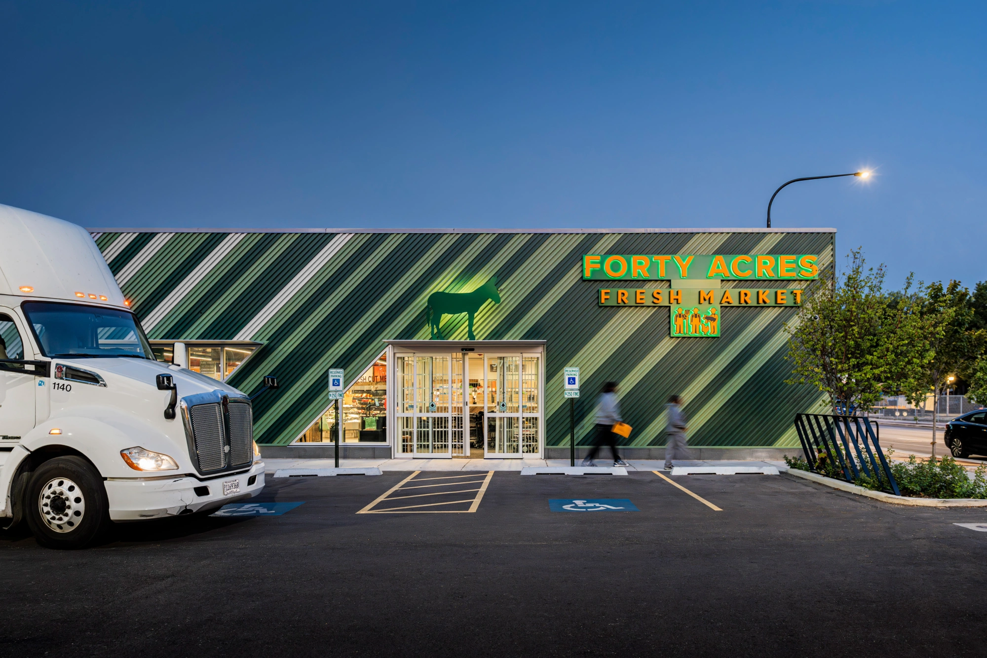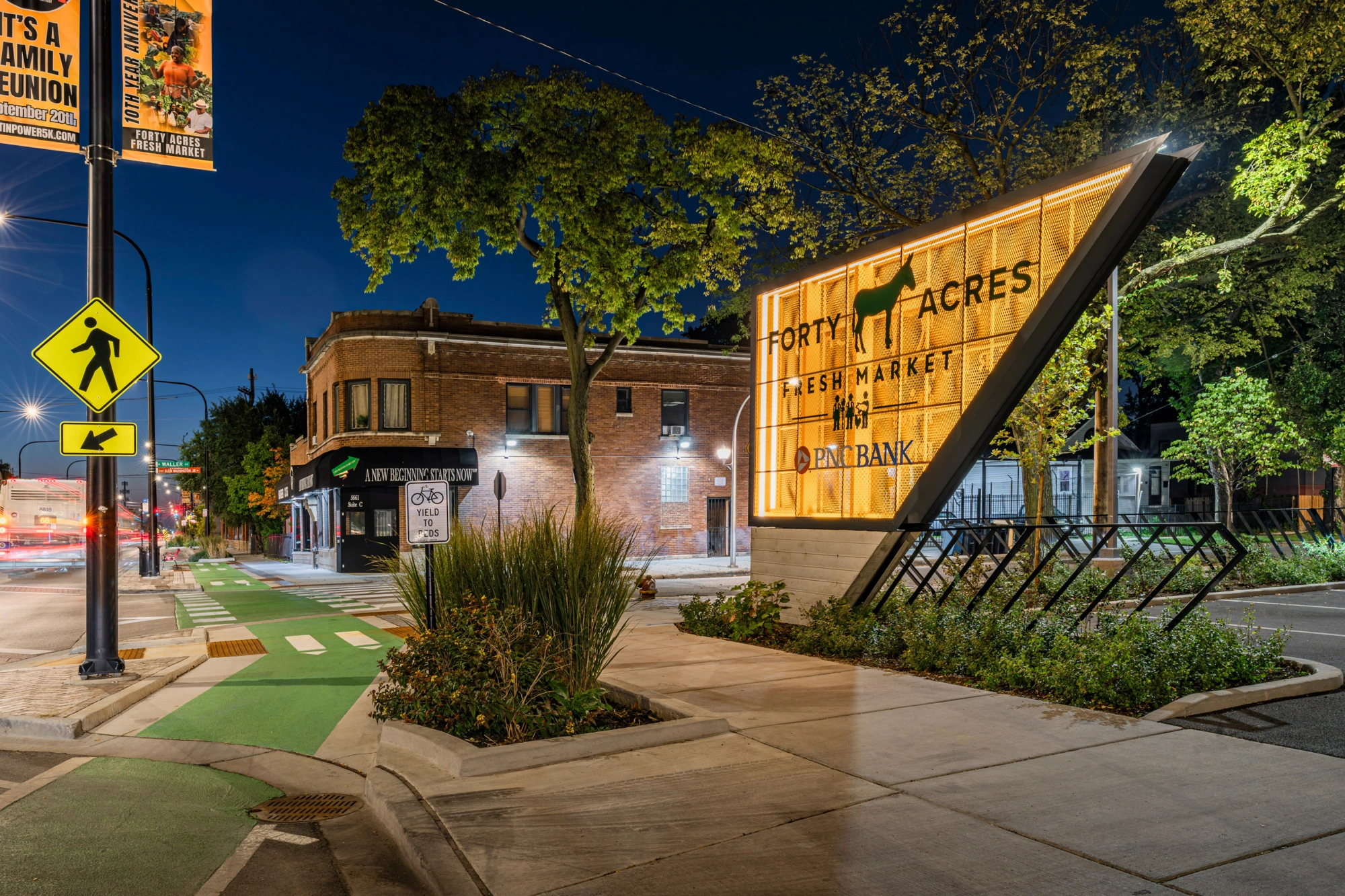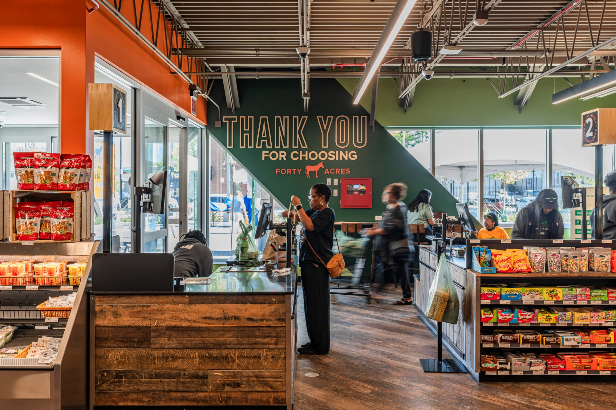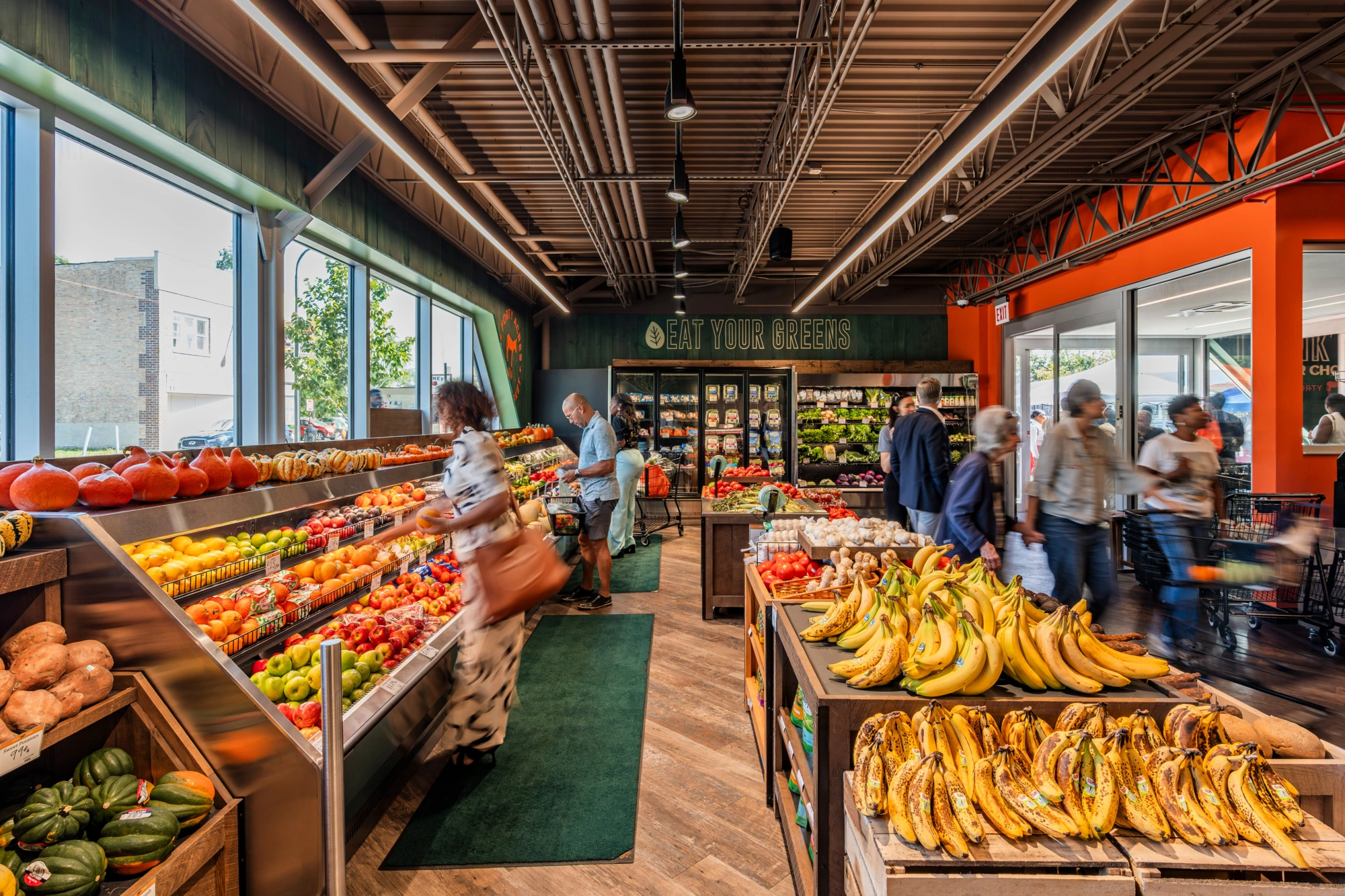 Serving Chicago’s Austin Neighborhood with fresh produce deliveries since 2018, Forty Acres Fresh Market acquired a former Salvation Army on Chicago Avenue to expand its operations into a full-fledged grocery store. Latent worked with Liz owner of FAFM + their community development partner West Side Health Authority to design the new grocery store with a featured Bank tenant space that was ultimately filled by PNC.
